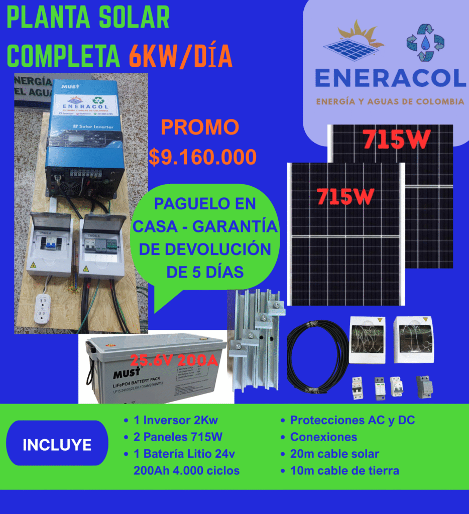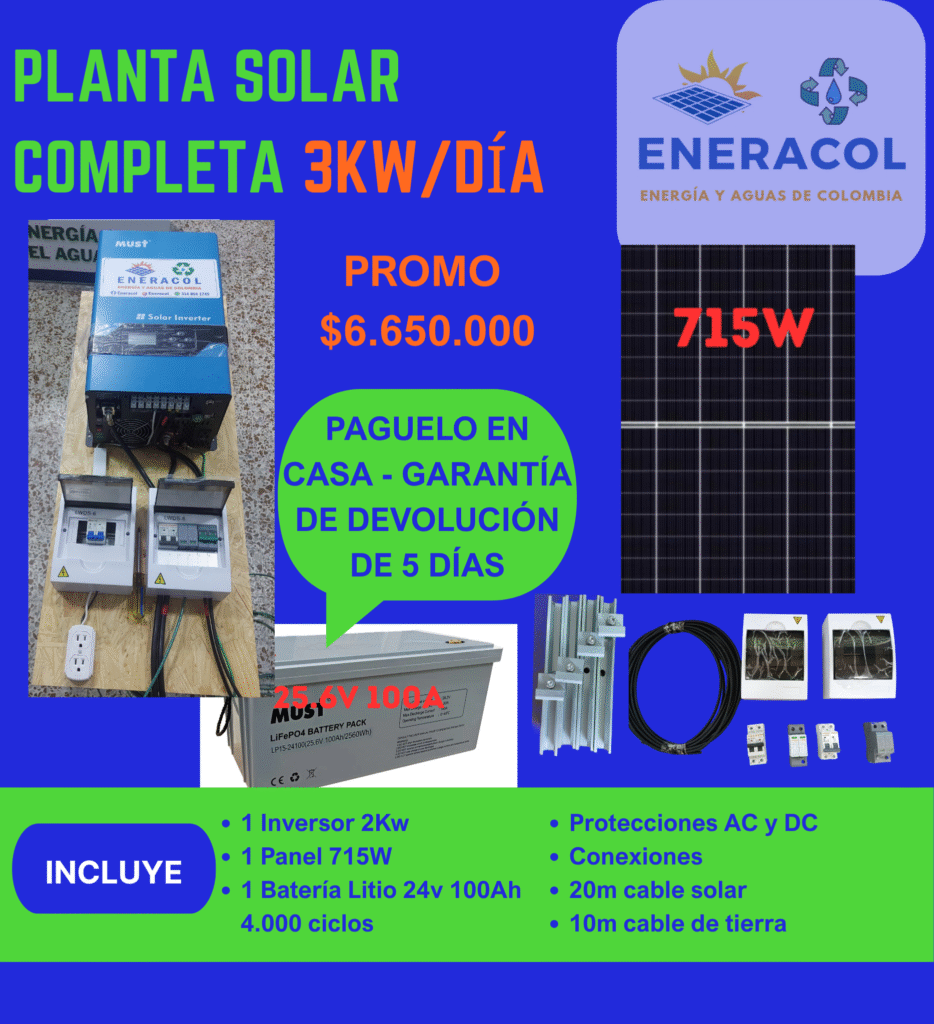 kit básico Incluye (todo ya armado): Inversor 2kW + 1 Panel 715W + 1 Batería Litio 24V 100Ah + 20m de cable solar+ 10m de cable de tierra + Protecciones + estructura de anclaje del panel + guía de conexión + soporte vía WhatsApp o telefónica.